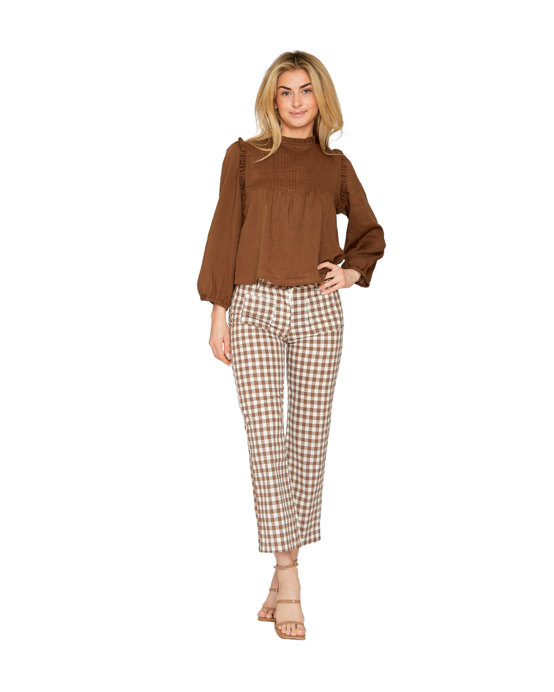 Styling Tip: wear the Rose Top with our Lily Pant or Rhodes Skirt in Brown Gingham for the perfect outfit to host a Fall brunch.